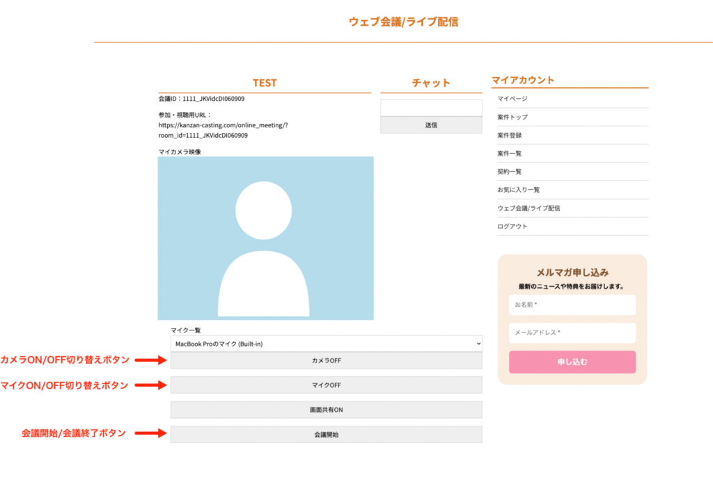 モードの「ウェブ会議モード」をチェックして「作成」をクリックするとウェブ会議が開始されます。