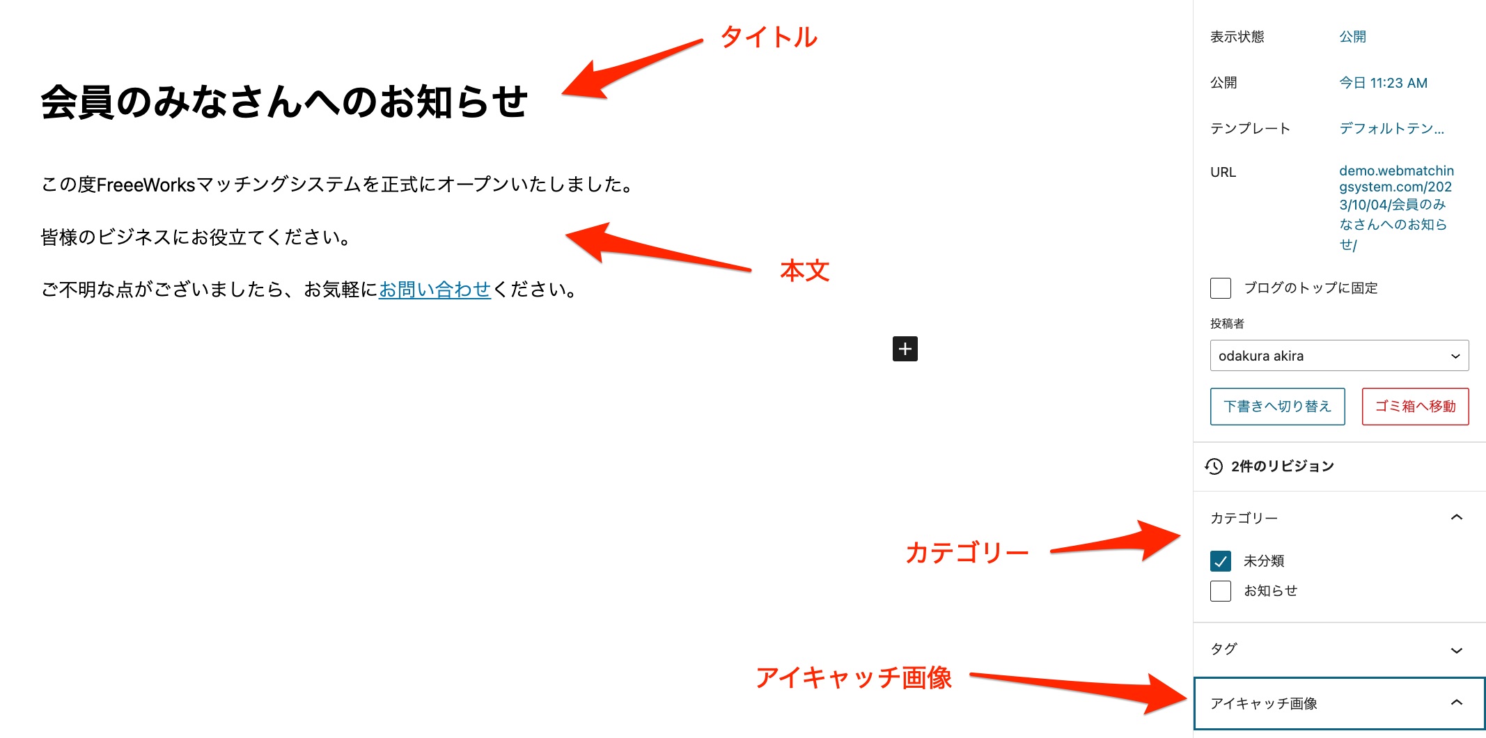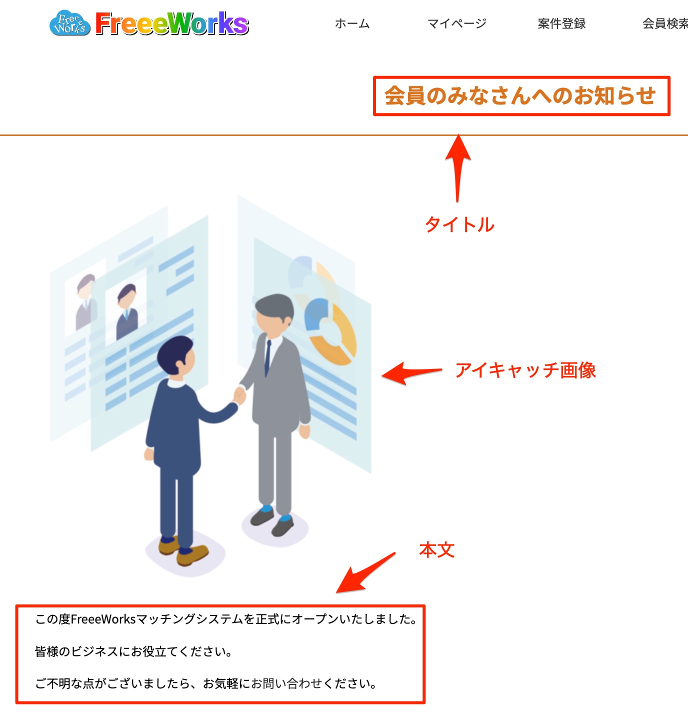タイトル、本文、カテゴリー、アイキャッチに登録した内容は会員には上図のように表示されます。